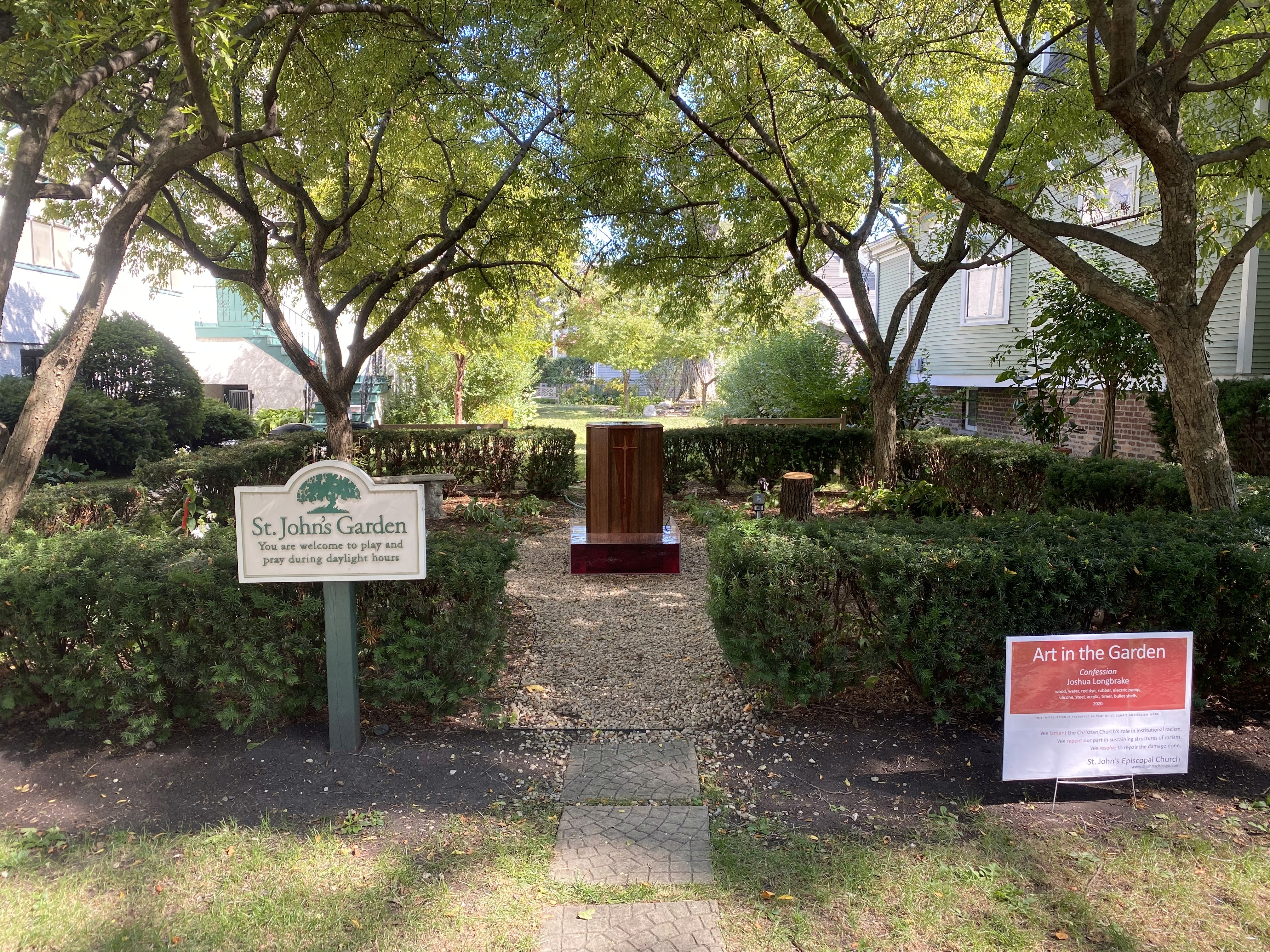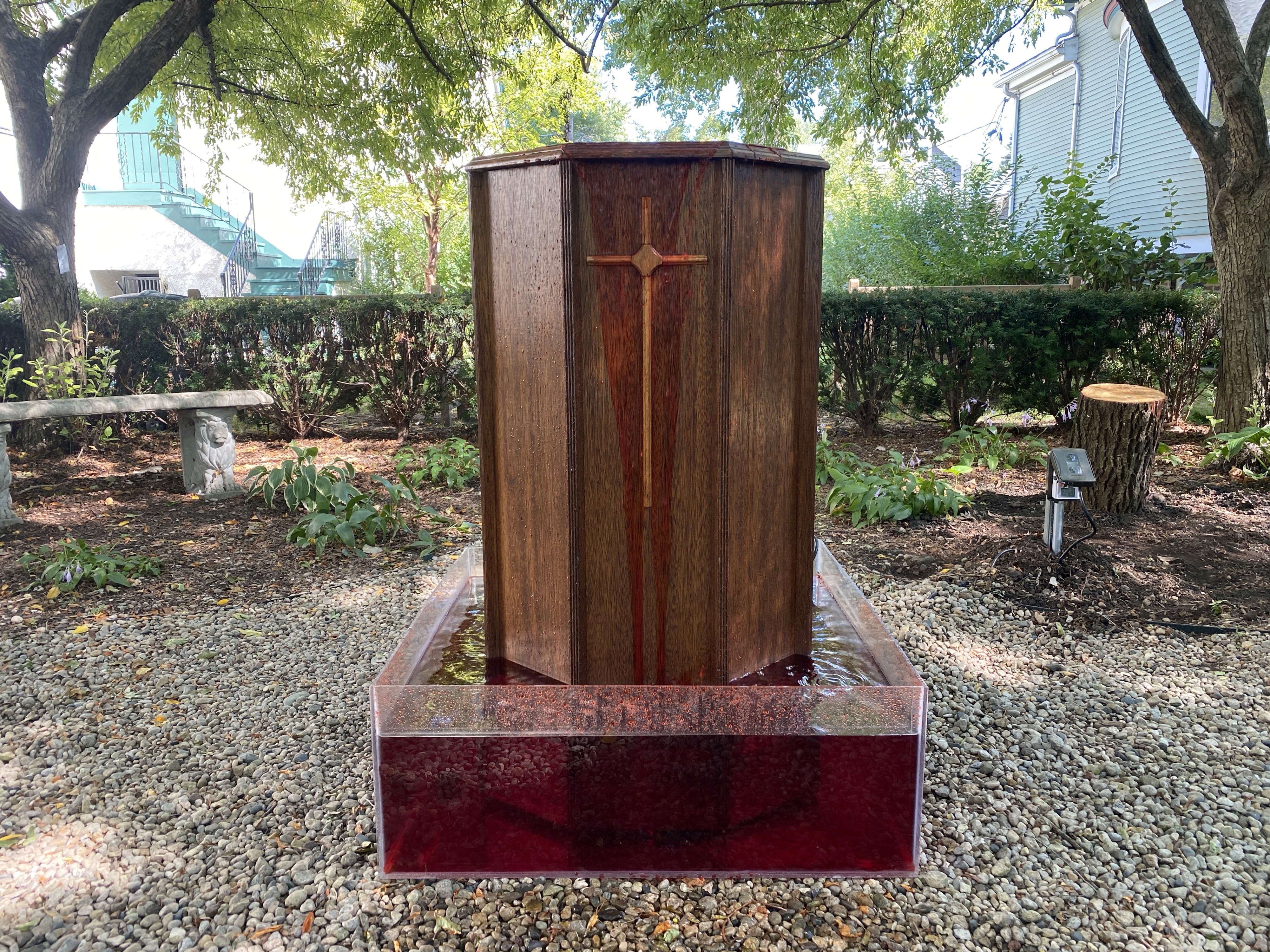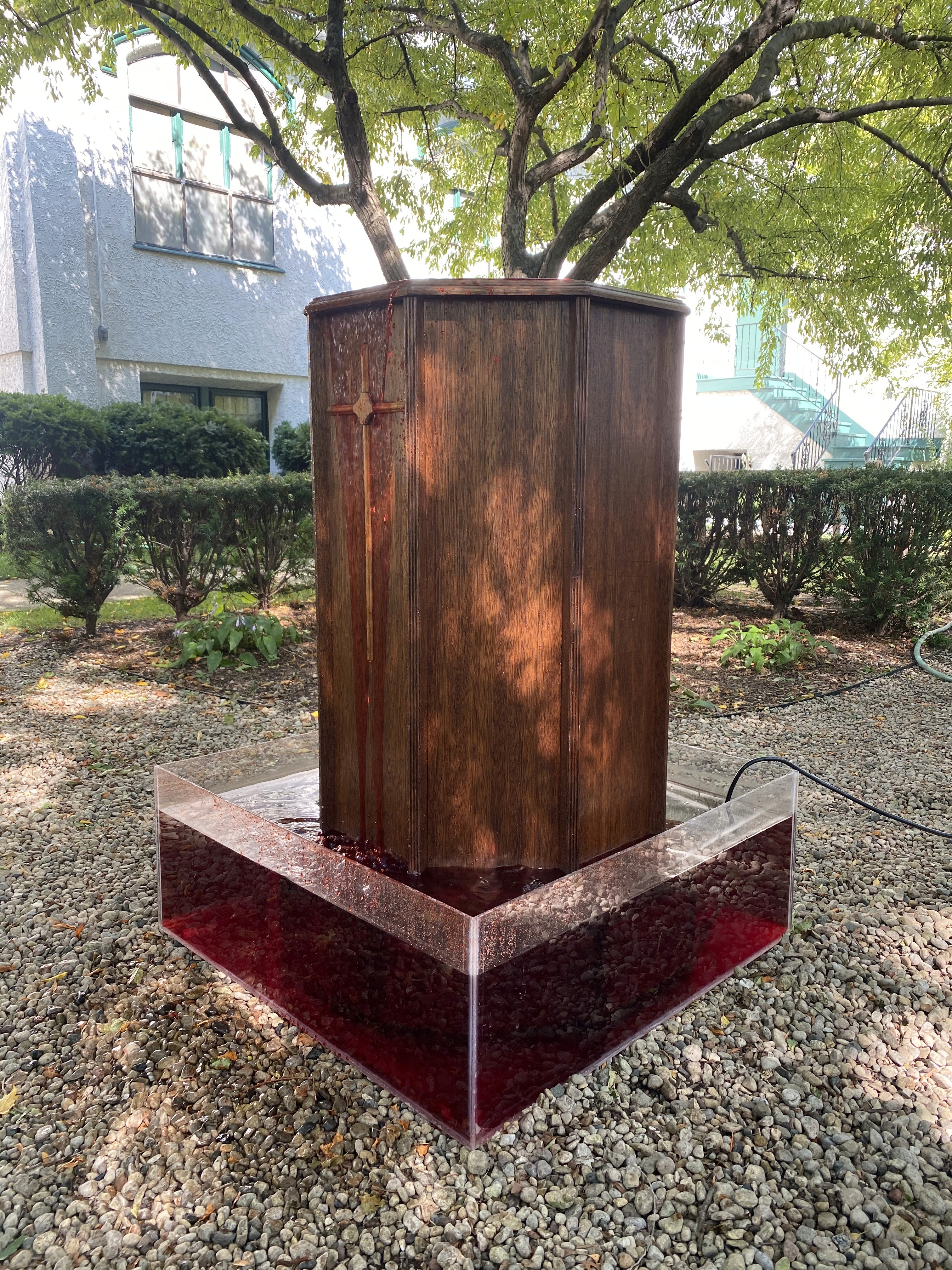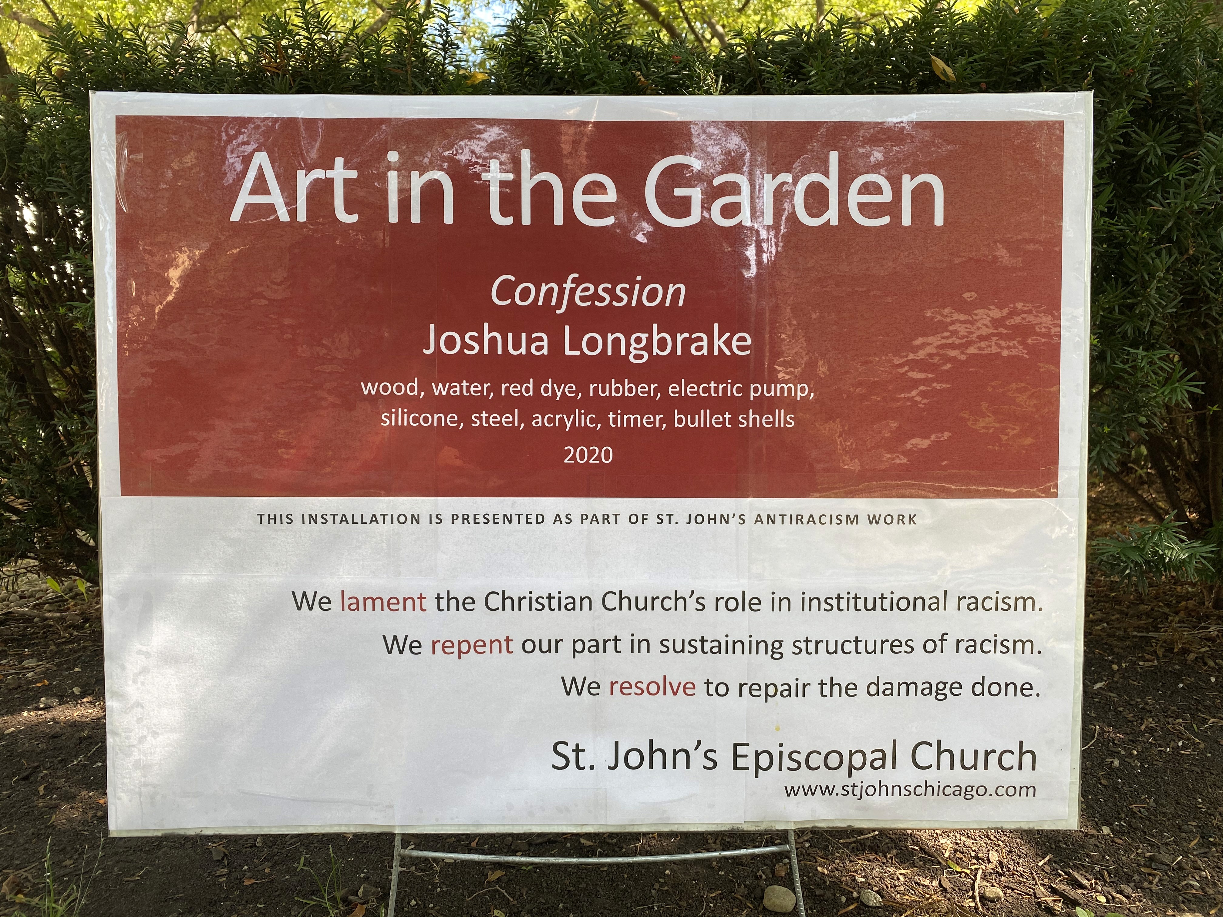 In the months following the murder of George Floyd and and the shooting of Jacob Blake in 2020, I had a conversation with my priest Kara about my own silence and the silence of the church regarding institutional racism. The result was an installation outside St. John’s, a font with a water pump that ran in intervals of on for 8m46s and off for 8m46s. The font was mounted on seven 9mm bullet shells. Our church, St. John’s, put the following words on a sign in front of the font: