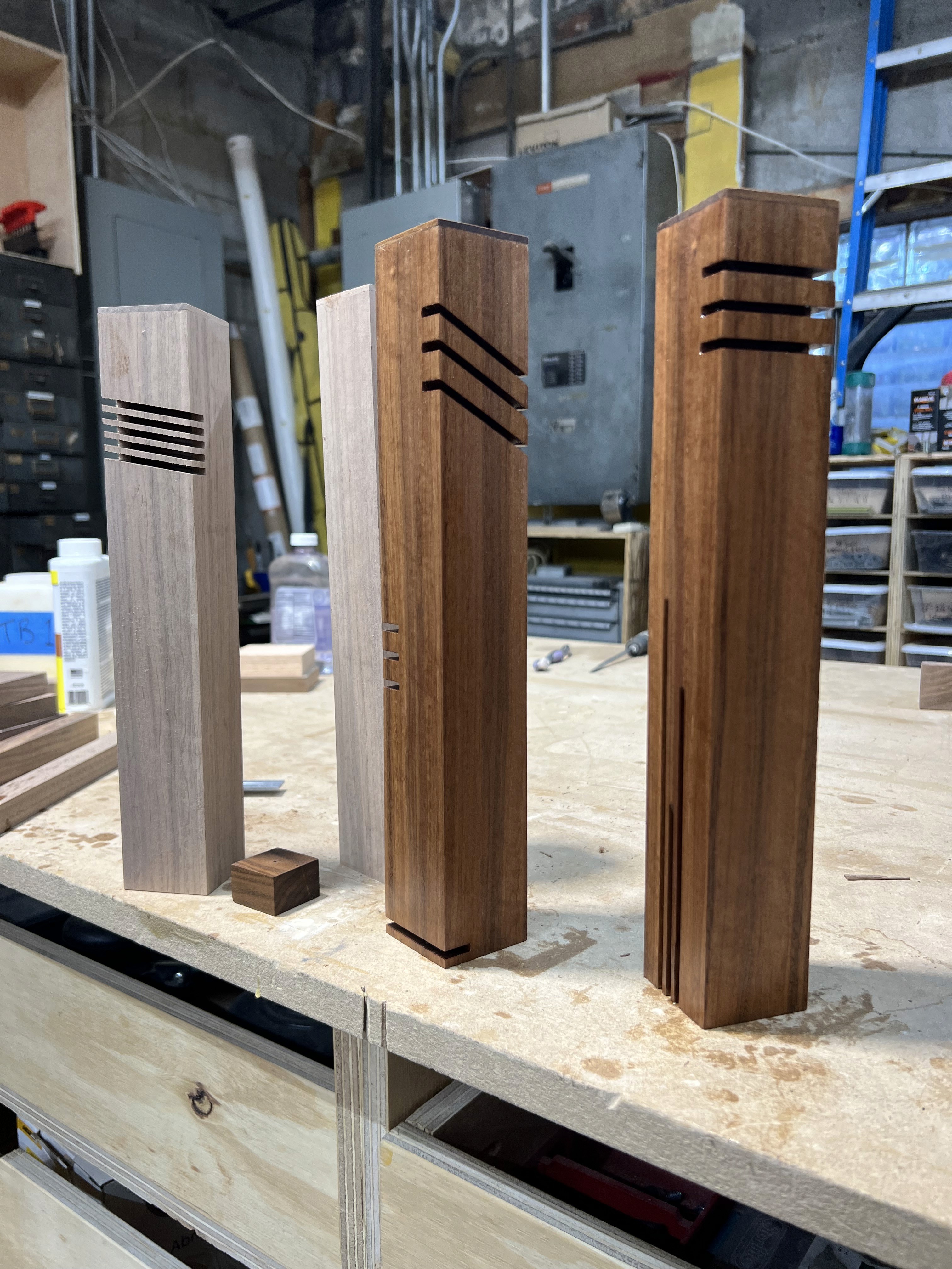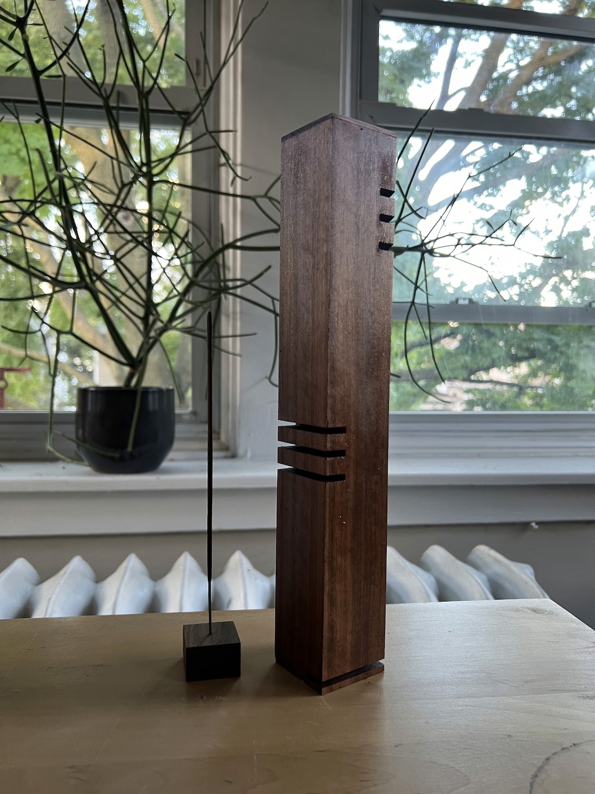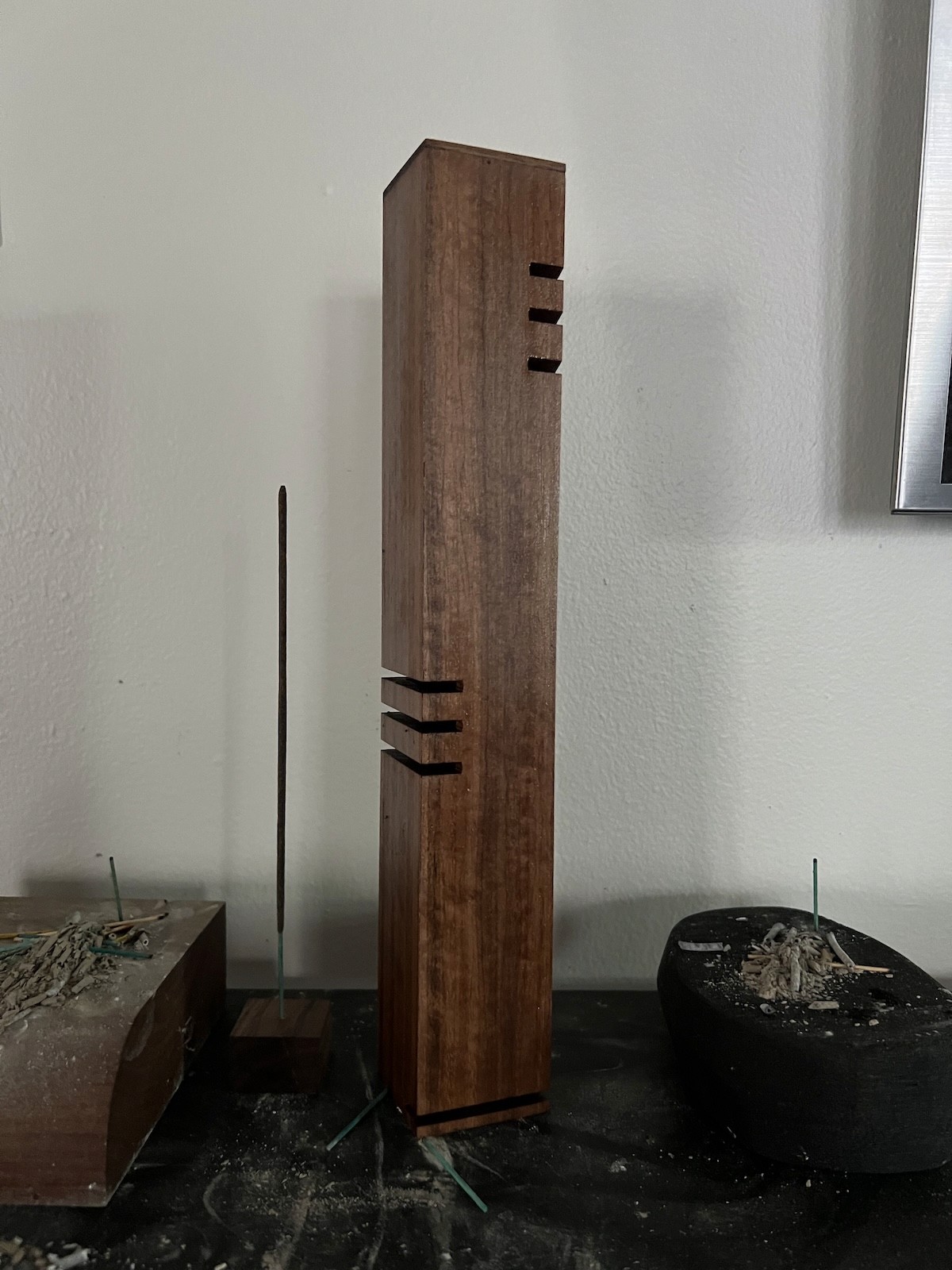 I was looking at images of Tadao Ando's architecture. The way he makes room for light makes me happy. I thought that smoke from the incense would look soothing coming out of similar shapes. The walnut incense pillar is hollow on the inside. Put the incense in the small square base, light it, set the pillar down over the incense stick. The smoke sifts gently out and up.